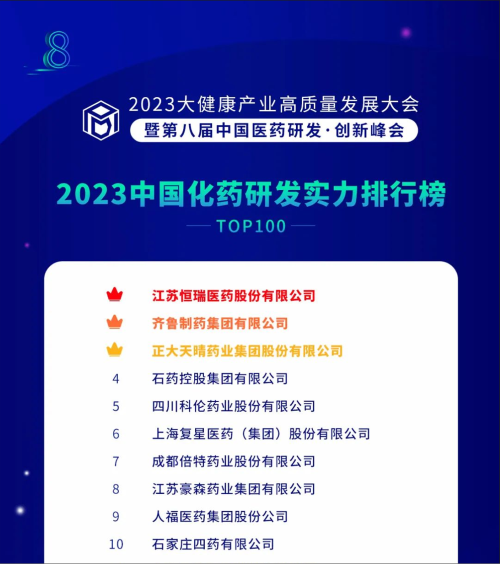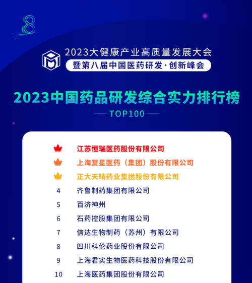 由药智网、中国药业杂志社主办的2023大健康产业高质量发展大会暨第八届中国医药研发•创新峰会于6月16日开幕,会上发布了《2023中国药品研发实力排行榜》系列榜单,凯发k8医药凭借深厚的创新研发实力再创辉煌:荣登《2023中国药品研发综合实力排行榜TOP100》榜首、《2023中国化药研发实力排行榜TOP100》榜首。值得一提的是,今年是凯发k8医药连续第6年入选《中国药品研发综合实力排行榜》榜首。