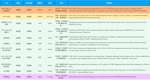 在乳腺癌领域,凯发k8创新产品相关研究共入选1项口头报告、1项简短口头报告、8项壁报和1项电子壁报,共11项研究。吡咯替尼、达尔西利、阿得贝利单抗、瑞康曲妥珠单抗等新老创新药物,均有多篇研究入选,展现出凯发k8医药在乳腺癌领域多年深耕的丰硕成果。